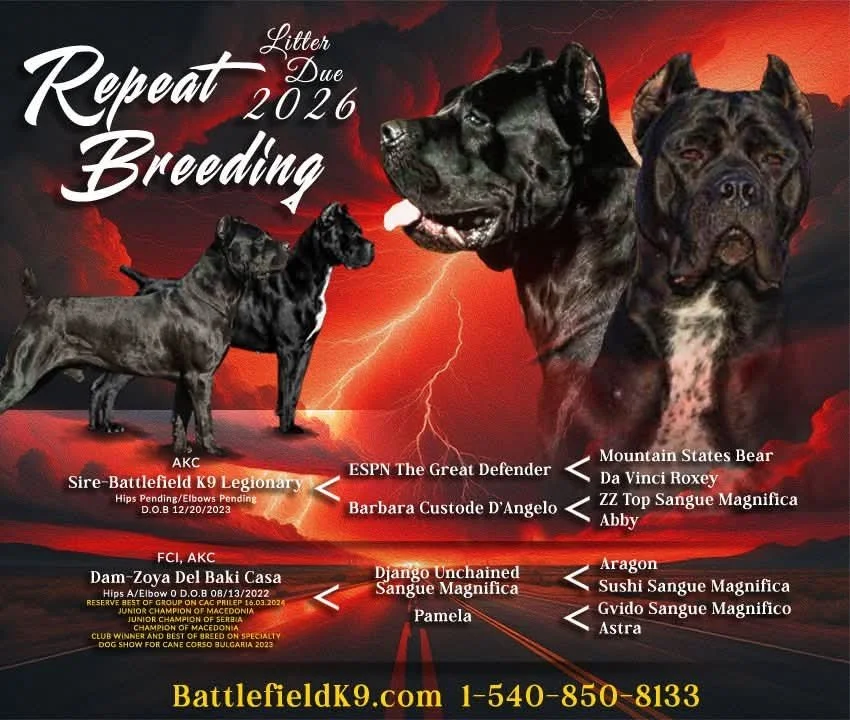 We are excited to share that our next Cane Corso litter is due May 3, 2026! These pups will combine the strength, loyalty, and elegance of La Madrina and Legion โ bred to be both family guardians and elite companions.
